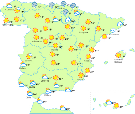 Stigende dagstemperaturer på store dele af halvøen og De Kanariske Øer, mens de er faldende i Middelhavsområdet. Nattemperaturerne falder generelt, og det giver frost i bjergrige områder og i den nordlige, indre del af halvøen.