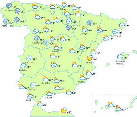 Overskyet i perioder i nord, med letskyet himmel i de centrale timer og tendens til igen at blive overskyet i slutningen af dagen. I resten letskyet eller klart. Temperaturer med få ændringer på 19 til 24 grader.