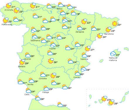 I Catalonien og på De Baleariske Øer forventes regn og lejlighedsvise byger i løbet af dagens første halvdel, men det er heller ikke udelukket med lidt svag regn til det østlige Cantabrian i de tidlige timer, og lejlighedsvis nedbør på kysterne i Alicante og Murcia.