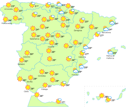 Stigende dagstemperaturer til de indre egne i nord og De Kanariske Øer. Nætterne bliver også lunere på halvøen og kommer igen op på normalniveauet for årstiden undtagen i Middelhavsområdet og det vestlige Andalusien, hvor de næppe ændrer sig meget. Vi overstiger 32 grader i dalene Tagus, Guadiana og Guadalquivir.