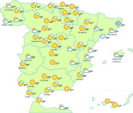 Overskyet med byger og torden, der lokalt kan være ret heftigt i Catalonien og endda også vedholdende på den nordlige kystlinje i første halvdel af dagen.