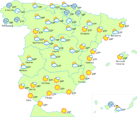 Stigende maksimumtemperaturer på halvøen og få ændringer på øerne. Lunere nætter i de indre, sydøstlige egne af halvøen, mens der ventes frost i Pyrenæerne.