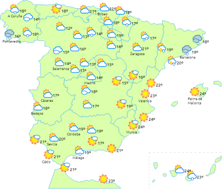 Bygerne kan lokalt være tunge eller vedholdende i starten i det nordlige af Valencia Regionen og i slutningen af dagen i bjergene i de indre egne.