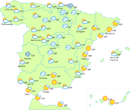 Generelt stigende temperaturer undtagen i Galicien og på Balearerne og De Kanariske Øer, hvor der vil være få ændringer. Frost til halvøens nordøstlige, indre egne.