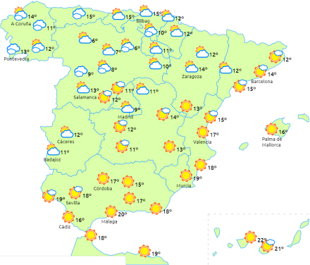 Skyet i perioder over resten af halvøens nordvestlige halvdel og Menorca, og perioder med lavthængende skyer til resten af halvøen og Balearerne.