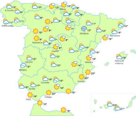 Faldende dagstemperaturer i Middelhavsområdet, de nordlige indre egne, Tagus-dalen og de indre egne af Catalonien, mens de er stigende i resten af landet - mest udtalt i den nordlige halvdel af fastlandet. Generelt faldende nattemperaturer med svag frost i de indre egne fra nord til syd og i bjergområder.