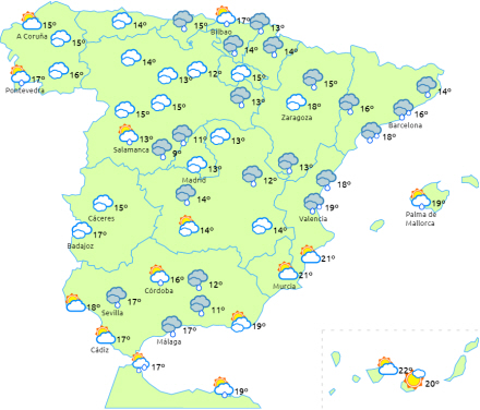 I Andalusien, Melilla samt på den østlige halvdel af halvøen og Balearerne er det skyet til overskyet med regn og byger, som lejlighedsvis kan blive ledsaget af torden.