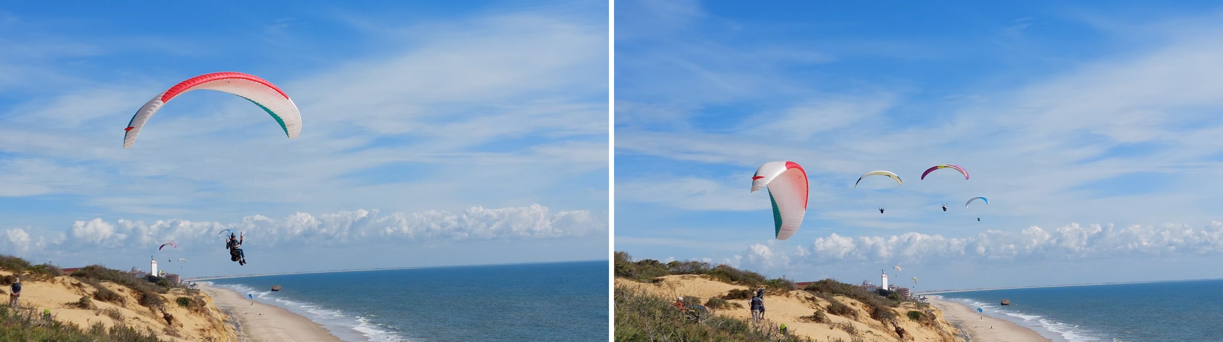 Camperpladsen er dog ikke noget for os, så vi fortsætter videre sydpå ad 483 til Matalascañas. Her finder vi overnatning på en grusvej langs med havet oppe på en høj skrænt. Og her er der igen gang i noget. Det er et godt sted for paraglidere, som hopper ud over klinten og udnytter pålandsvinden blæser dem i højden langs med klinten.