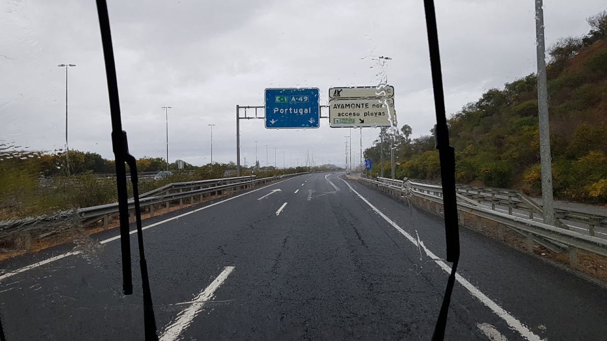 Men vi kører alligevel videre. Og heldigvis regner det rimeligt i starten, så vores vinduesviskere kan gøre forruden ren. Der er ikke sprinkler på beholderen for tiden. Vi fandt faktisk noget sprinklervæske for nogen tid siden i et supermarked, da beholderen gik tom. Men alt er jo vægt og man må nøje overveje nødvendigheden af mere vægt hele tiden. Peter vekslede indkøbet sprinklervæske om til fem flasker rødvin, det regner jo alligevel aldrig i Spanien…