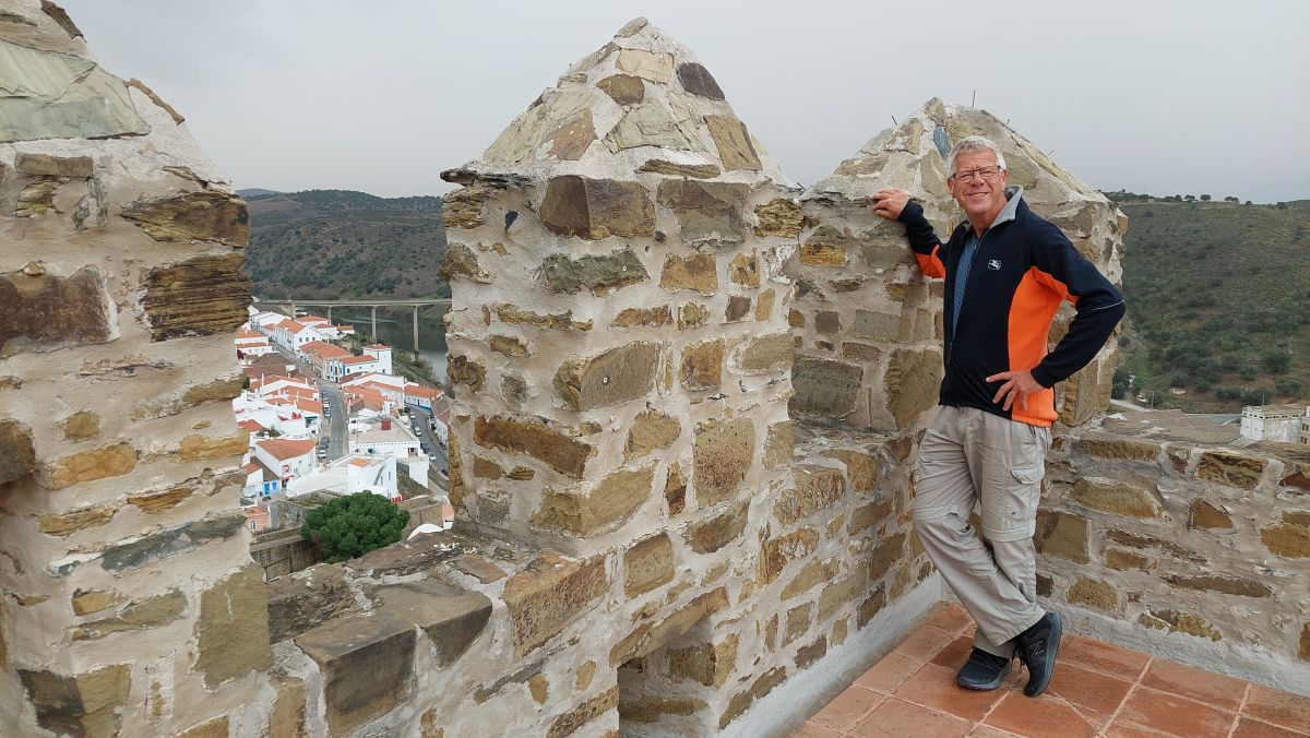 I Mértola holder vi ind og ser os lidt omkring. Og finder en rigtig fin plads at holde på. Adgangsvejen er godt nok stejl og smal, men nedad er jo ikke et problem. Og sidespejlene har vi stadig, da vi når ned til floden Guadiana.