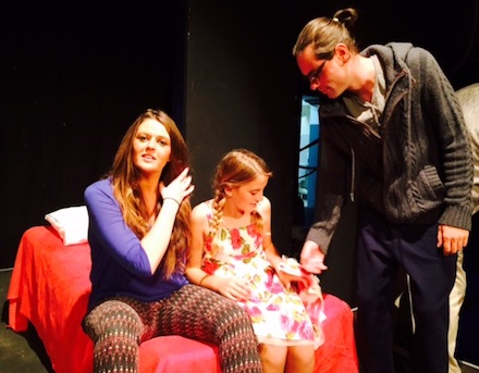Mette (Chloe Carron), Helges barnebarn (Ellie Parkinson) og toastmaster Helmuth (Kyle Claramonte)