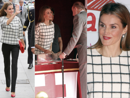 Letizias ternede, sort-hvide uldbluse lavet af det danske Designers Remix, kombineret med sorte Hugo Boss bukser, fire-tommer højhælede sorte sko og en knaldrød klubtaske af Tissa Fontaneda satte for alvor den spanske dronning i fokus, da hun deltog i en ceremoni i forbindelse med ti-årsdagen for Fundeu fonden, en afdeling af den spanske storbank BBVA i Madrid.