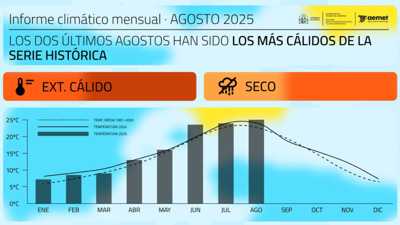 Ifølge det spanske meteorologiske institut, AEMET, har både august 2024 og august 2025 haft en gennemsnitstemperatur på 25 grader, hvilket gør dem til de varmeste nogensinde.