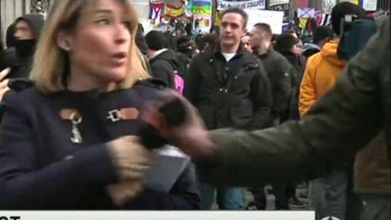 Sascot formåede på imponerende vis at fortsætte sin dækning af begivenheden på Place de la Bourse; hun hev mikrofonen tilbage fra en af mændene, mens en anden kvinde prøvede at få dem væk.