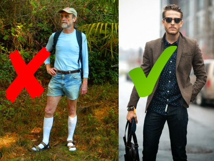 Blandt de velkendte klassikere er strandløven i Bermuda-skjorte, der er knappet op helt ned til navlen og selvfølgelig strømper i sandalerne.