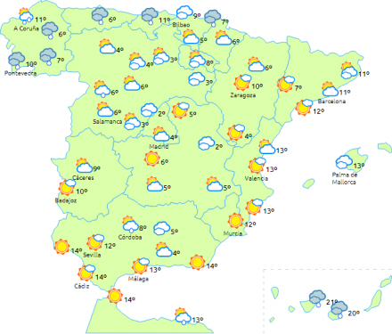 Faldende temperaturer i dagtimerne på Atlanterhavssiden og langs den cantabriske kyst samt i Pyrenæerne med ellers få ændringer i resten. Frost til den nordlige halvdel af halvøen og de sydøstlige bjerge - lokalt tung frost i Pyrenæerne.