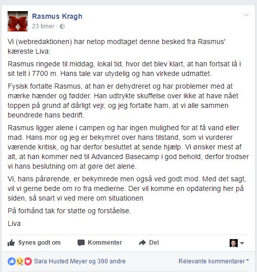På Kraghs Facebookside skrev hans familie, at bjergbestigeren var kommet i problemer, mens han var på vej ned af bjerget igen. Liggende i 7700 meters højde havde han fået kontakt til familien, som var meget urolige over situationen.