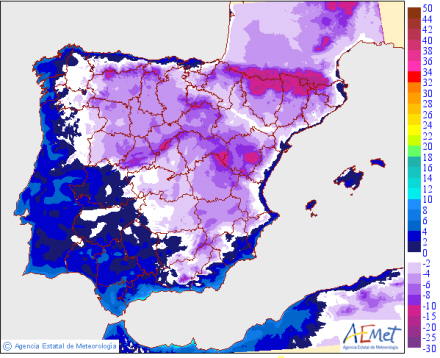 Det forventes, at temperaturerne begynder at stige lidt igen fra fredag, men der vil altså fortsat være udbredt frost undtagen i kystområder og den sydvestlige del af halvøen. Fortsat risiko for nedbør på Balearerne og i sydøst.