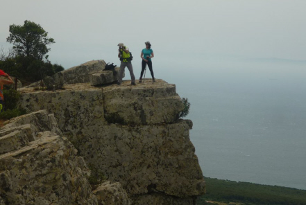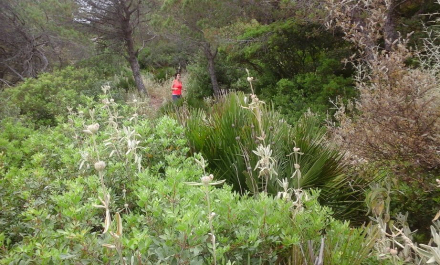 Stien fortsætter med en svag stigning op ad, og deler sig på et tidspunkt i to: En sti for fodgængere – med bom over – og en anden for ryttere. Stien for fodgængere snor sig gennem et vildnis – resterne af den gamle autentiske Middelhavsskov og slet ikke at forveksle med palmer og fyrretræer.