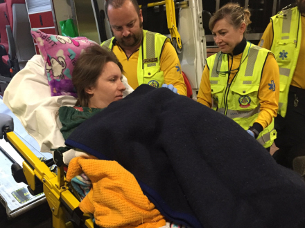 Kvinden blev lagt på en båre, så ambulancefolkene kunne sætte gang i det såkaldte "hud mod hud", der er den sædvanlige manøvre umiddelbart efter fødslen. Her bliver barnet lagt på moderens bare bryst, så den den kan mærke moderens varme og kropslugt.