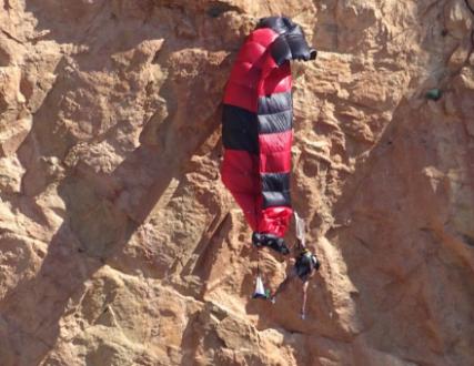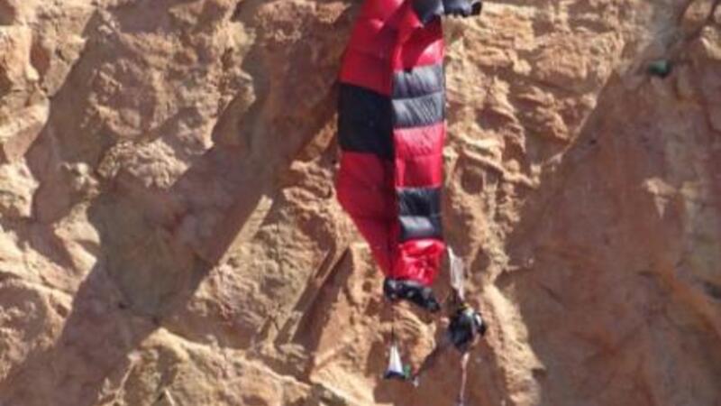 REDNINGSAKTION: Kraftig vind blæser ung paraglider ud af kurs og efterlader ham dinglende fra klippeside, men heldigvis er to helte fra brandvæsnet på pletten.