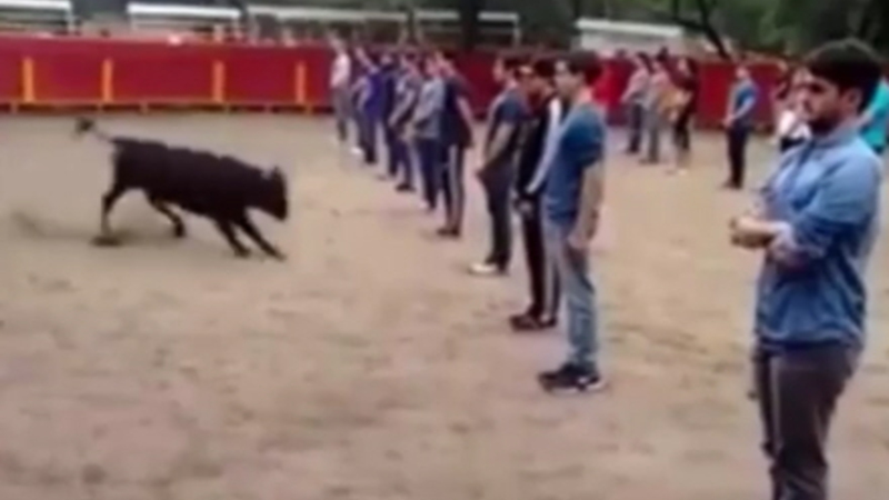 Salvador Raya, en spansk blogger, har offentliggjort en video, hvor du kan se en tyr løbe tæt forbi og rundt om 40 stillestående unge mennesker.