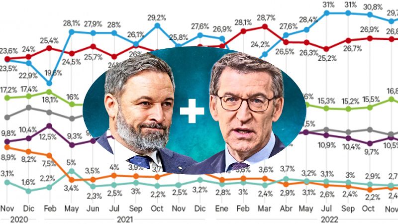 PP stiger til 31 procent og vil få et absolut flertal med Vox med mellem 176 og 185 mandater. PP og er nu fire point foran PSOE, som stagnerer på 27 procent.