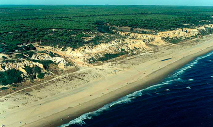 Vilde klitter og pinjetræer på kanten af skrænterne fører helt ned til strandene