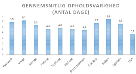 USA, Storbritannien, Holland, Finland og Tyskland er de lande, som booker det korteste ferieophold med en gennemsnit under fem dage. Italien og Norge holder ferie længst med et gennemsnit over seks dage.