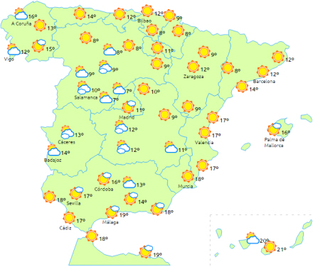 Skyet i Galicien, Extremadura og de nordlige og sydlige indre egne, men det klarer op i eftermiddag. Overvejende letskyet i resten af landet, så der kommer masser af sol.