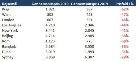 Flypriser med størst fald i 2010'erne