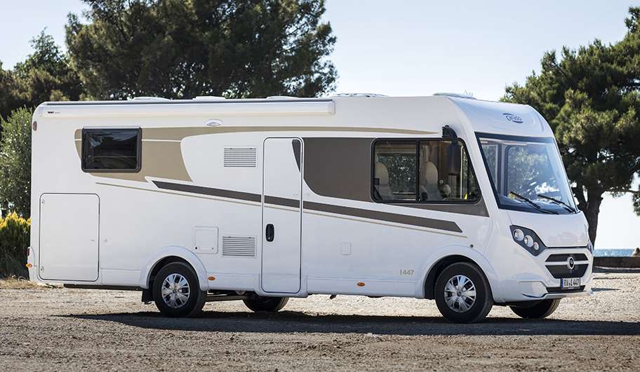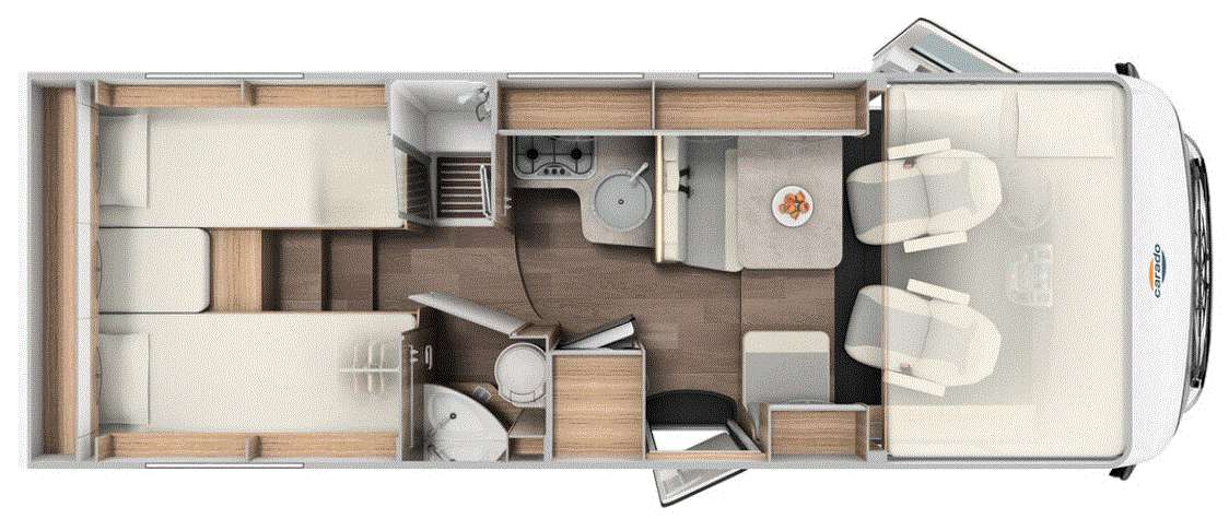 Vores camper, er en model Carado I447. Det er en helintegreret vogn, 7,48 m lang, 2,30 m bred (+ sidespejle har vi lært) og 2,95 m høj. Og køres på et alm. kørekort.