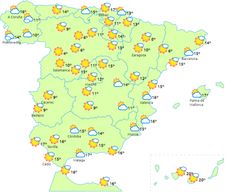 Stigende dagstemperaturer i Galicien, Cantabrien og Ebro-dalen, mens de falder i de områder med vedvarende tåge. Nattemperaturerne er uændrede med svag frost i halvøens indre egne - lokalt lidt tungere frost i de indre egne i nord, de centrale bjerge og Iberiske Randbjerge samt i Pyrenæerne.