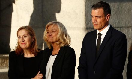 Enken Pilar Goya flankeret af Ana Pastor og Pedro Sánchez ved bårens ankomst