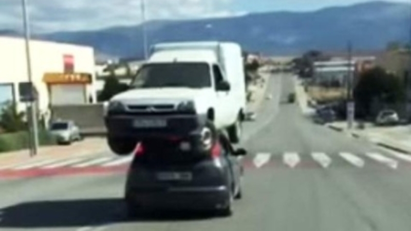Sådan råber den bilist, der filmer en bilist, der i en Ford Focus transporterer en Renault-varevogn på taget i et industriområde. Formentlig i Segovia.