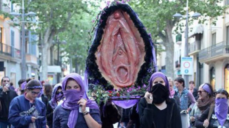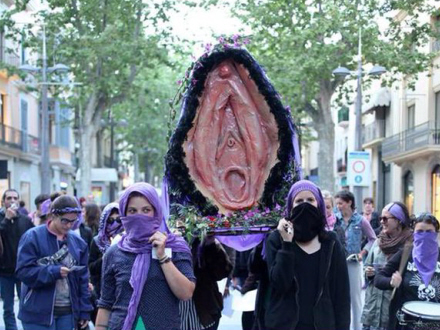 De tre kvinder bar tilbage i 2014 en mere end en meter høj plastik-vagina igennem Sevillas gader i forbindelse med en 1. maj demonstration.