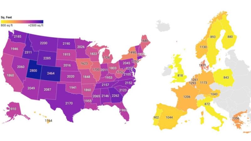Boligsitet Idealista.com bringer et kort, som viser, at praktisk talt alle amerikanske stater overstiger 130 m2 i gennemsnit, og de er dermed langt foran samtlige europæiske lande. På kortet er målene angivet i fod, mens tabellen nederst i denne artikel viser det i m2.