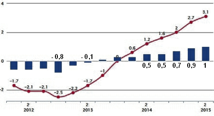 Blå kasser er den kvartalsvise stigning, den røde kurve er stigningerne i forhold til samme tidspunkt året før