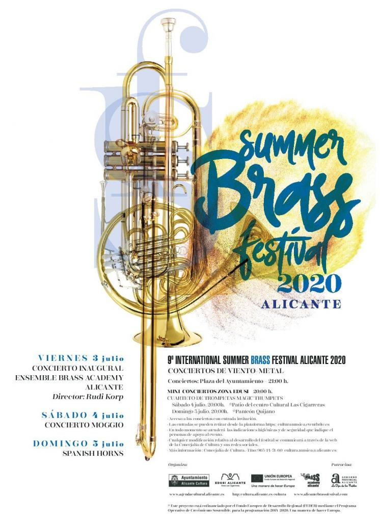 - Kulturafdelingen i Alicante byråd har i samarbejde med Brass Academy Alicante, under hensyntagen til nogle kapacitetsbegrænsninger, besluttet at fortsætte Summer Brass Festival 2020 og fejrer dermed sin niende udgave i de kommende dage, specifikt i løbet af weekend og på Plaza del Ayuntamiento, siger byrådsmedlem Antonio Manresa.
