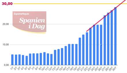 Udviklingen i smittetallet i hele juli. Som det tydeligt fremgår af tendensen vil smittetallet inden få dage sandsynligvis bryde gennem grænsen på de maksimale 30,00