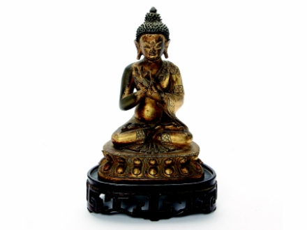 1) Belærende Buddha af forgyldt bronze, siddende på lotustrone. Nepal, 19/20. årh. H. 16 cm. Vurdering: 3.000-4.000 kr. Hammerslag: 25.000 kr.