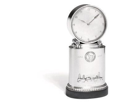 2) Gundorph Albertus: Stort bordur af hammerslået sterlingsølv smedet i oval form, fodstykke af sort sten. Front med emblem og prospekt over- samt inskription fra Dansk Andels Cementfabrik 1912-1937. Georg Jensen 1933-1944. H. 32,2. Vurdering: 20.000-25.000 kr. Hammerslag: 120.000 kr.