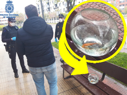 Fredag delte Policía Nacional et billede på Twitter af en mand, der havde taget sin fiskebowle under armen for at lufte guldfisken i Logroño, La Rioja.