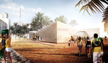 Kongeskibet Dannebrog har lagt til i Rio, og på stranden er der opført en dansk pavillon for at promovere Danmark under legene.