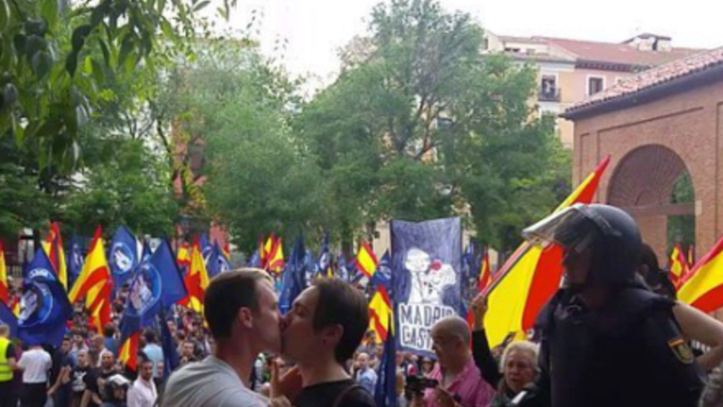 Lørdag viste et homo-par stort mod, da de kyssede foran en aggressiv gruppe ny-nazister i Madrid.