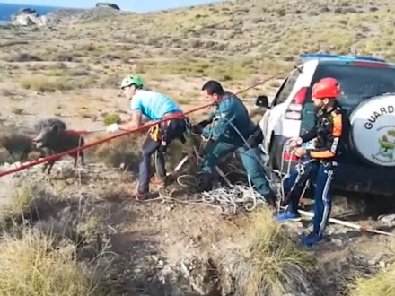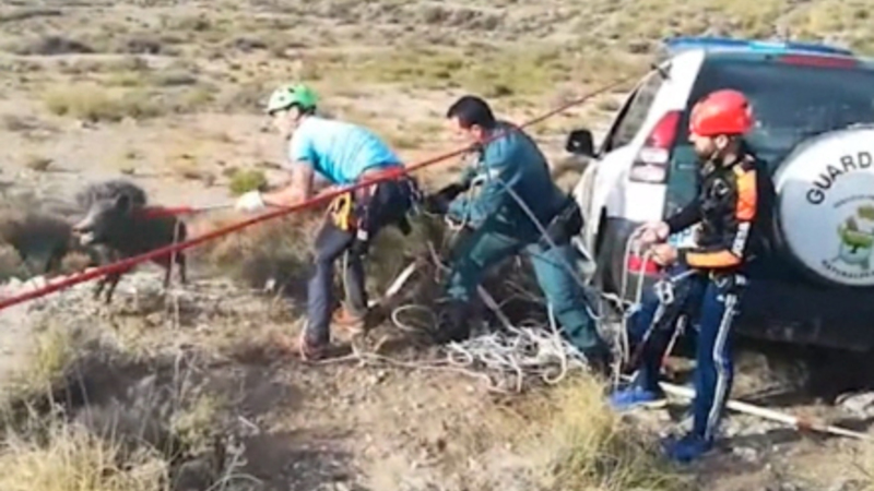 Søndag aften Guardia Civils særlige dyretjeneste på en noget utaknemmelig redningsaktion, da en hund og fire vildsvin var faldet i en brønd i Almería.