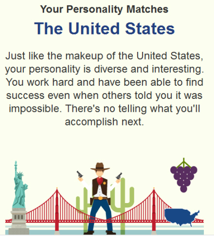 Du kan eksempelvis også tage en test, der viser dig, hvilket lands vin, der passer til din personlighed. Her skal du svare på forskellige spørgsmål som musiksmag, hvem skal skrive din biografi og hvordan du opfører dig i sociale situationer. Hvordan det lige skal sige noget om vin, står hen i det uvisse, men ifølge testen bør undertegnede smutte til USA: