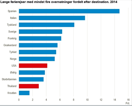 Spanien var i 2014 - som i tidligere år - danskernes klart foretrukne feriedestination, når de rejste udenlands i mindst fire nætter. 15 procent af samtlige lange udenlandsrejser gik således til Spanien, herunder også de Kanariske Øer. Herefter fulgte velkendte ferieklassikere som Italien med 10 procent, Tyskland med 8 procent og 6 procent i Sverige, Frankrig og Grækenland.