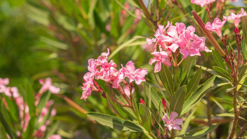 Når du færdes i trafikken på de spanske landeveje, har du sikkert lagt mærke til, at midterrabatten ofte er beplantet, og at det næsten altid er samme slags høje buske med aflange, laurbærlignende blade og ofte med blomster i forskellige flotte farver.