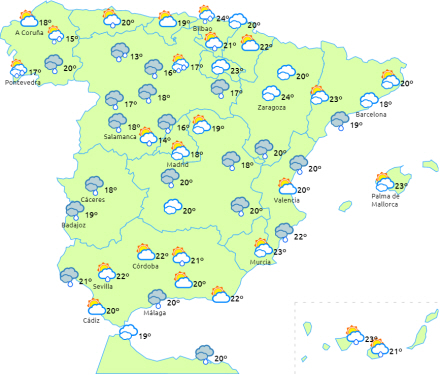 I den nordlige del af Aragón kommer der dog nok nogle byger om morgenen, og det kan også dryppe lidt i Catalonien og på Balearerne.